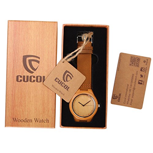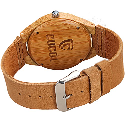 CUCOL Natural Bamboo Wooden Watch with Genuine Brown Leather Strap Japanese Quartz Movement Cas...