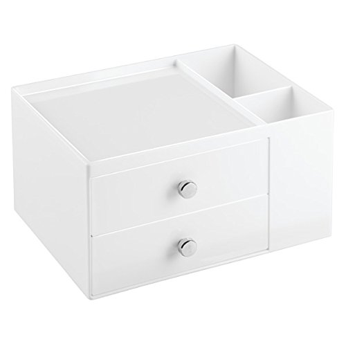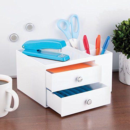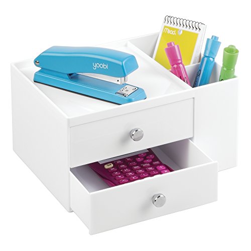 mDesign Office Supplies Desk Organizer for Staplers, Scissors, Pens, Markers - 2 Drawer Side Caddy, White