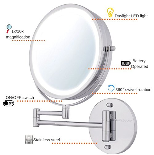 - COMPREHENSIVE – This dual-sided 360° swivel design luxury mirror features 1x10x magnification. 1x for a great view of your entire face all at once, and 10x for precision, because every detail counts (8.5” diameter)