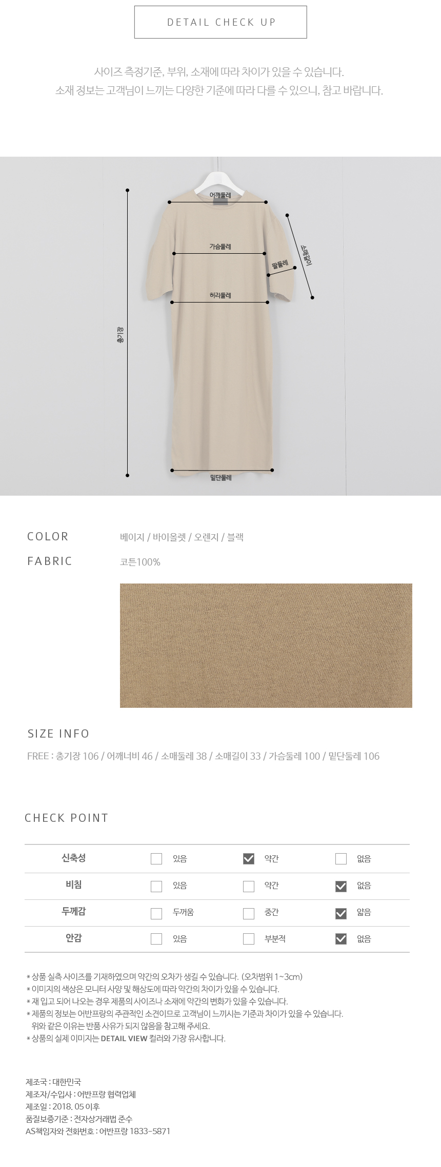 트렌디한 둥글게 떨어지는소매라인이 포인트가 되어주는네추럴핏 코튼 원피스에요단정한 라운드넥에 붙지 않아편안한 소매라인과 일자로 툭떨어지는 네추럴핏이 편안하고 예쁘답니다무릎을 살짝 덮는 길이감으로편안한 데일리룩부터 단정해야하는자리까지 모두 커버되는 원피스에요탄탄한 코튼소재의 조직감으로 핏이잘 잡히고 형태변형이 적어자주 손이갈 아이템이랍니다색상은 베이지, 바이올렛, 오렌지, 블랙사이즈는 FREE 44~66반