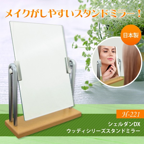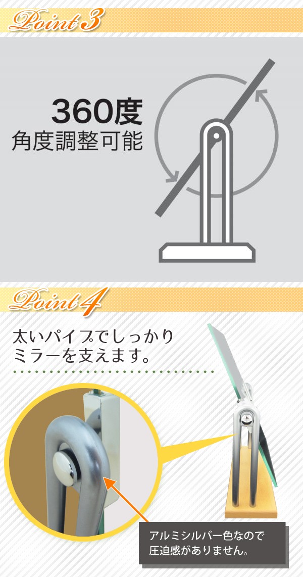 | <h1>台座にMDFを使ったスタンドミラー。面取りがきれいで、豪華な5mm厚ミラーを使用。360度角度調節が可能なので、しっかりメイクを楽しみたい方に♪</h1> |