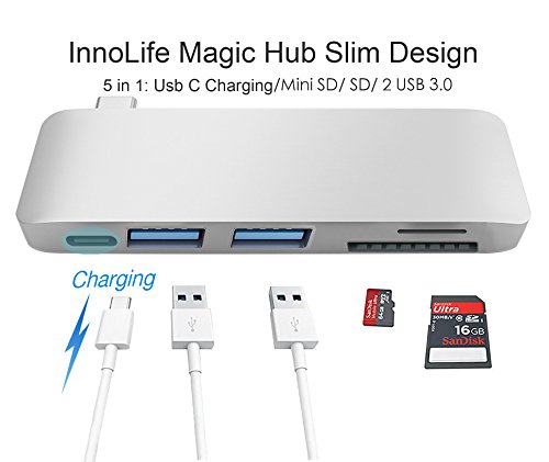 -. Feature : Magic Expansion Solution for New MacBook:INNOMAX MacBook USB Type C Hub has 5 N 1 design and will expand one type C port on your device to be two USB 3.0 ports, a SD and Micro SD card slot, and a usb type c charging port. / Compatible with All Computers with USB C Port: Specially Designed for 2016 New Mac Pro as well as other computer using type C, for example: Chromebook Pixel etc. / Aluminum Slim & compact Design:INNOMAX MacBook USB C Hub applied a super slim design with high quality deluxe aluminum alloy exterior and has an LED activity indicator. It Also has EMI protection to prevent interfere with wireless devices to allow you to connect Camera SD card/ Cellphone Mini SD Memory card, USB mouse, USB wireless mouse Adapter, U Disk etc more stably and safely. The compact and easy-to-use design allow carry it anywhere you go to make your work and life more conveniently. / Fully Functional USB 3.0 Technology: InnoLife MacBook USB C Adapter provide two fully functional USB 3.0 Ports which compatible with USB1.1. 5, USB 2. and USB 3.0 devices. All the two USB 3.0 port can provide the high speed data transmission up to 5Gbps. / No Software and Driver requirement: Plug and Play. MagicHub does not require any software, drivers, or complicated installation process. Smart Charging: USB 3.0 Port provide Max 0.5 A to charge iPhone or other cell phones. Power Delivery: USB C port on MagicHub allow you to charge your MacBook directly charging your MacBook while connecting to other devices.