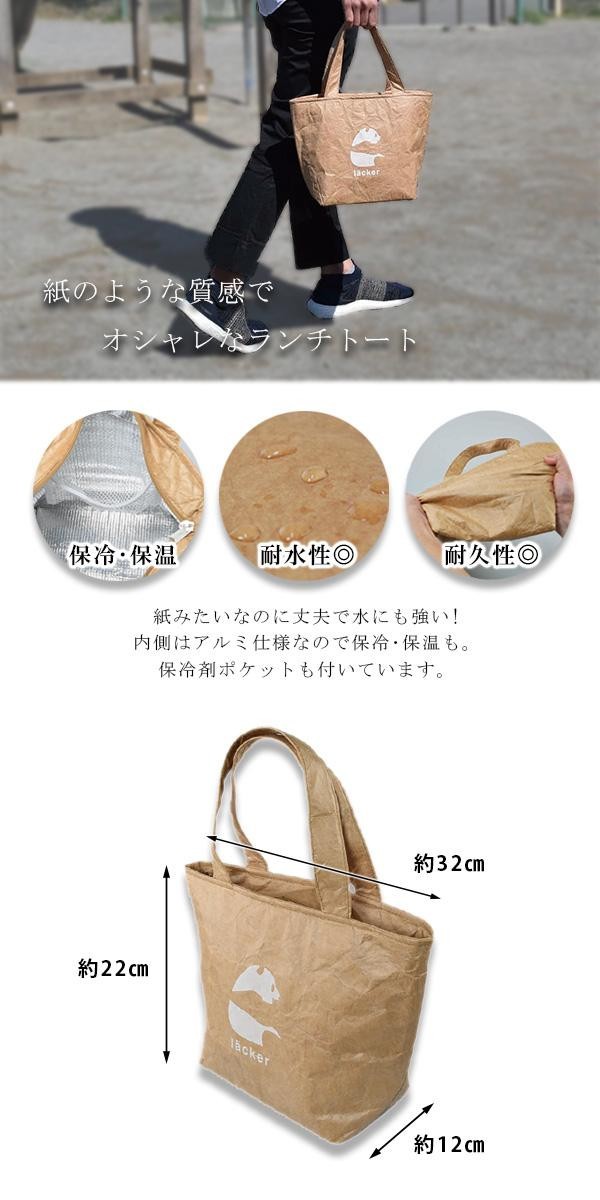 | 紙のような質感で軽いランチバッグ。紙みたいなのに、とっても丈夫で水にも強い!内側はアルミ仕様、保冷剤を入れる事ができるポケットがついています。 |