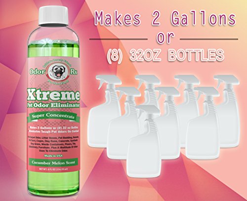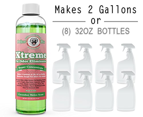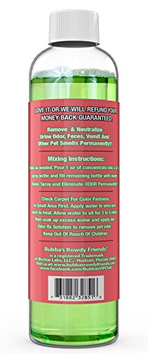 -. Feature : MAKES 2 GALLONS - Extremely Effective Pet Odor Eliminator: Our pet odor remover doesnt mask odors, it neutralizes them on contact. Formulated with more than 70 natural oils that when combined together create an extremely effective Floor & Carpet Deodorizer that will eliminate pet odor on contact better than any top rated pet odor and stain removers on Amazon at a fraction of the cost / Grrreat Dog Odor Eliminator: Our dog deodorizer and Odor neutralizer makes a great dog spray that will eliminate smells on Dog Bedding, Pet Furniture, Kennels, Pet Taxis, Synthetic Dog Grass, Concrete and Cages. Remove odors caused by dog urine, feces & vomit. Eliminate dog pee smell to prevent re-marking on rugs and floors. Guaranteed to permanently destroy odors on contact / Purrfect Cat Odor Eliminator: Bubbas Xtreme concentrate makes a powerful cat spray and cat urine odor remover for those tough cat pee odors left around the litter box, cat bed, cat furniture, rugs, carpets and floors. Our formula works better and is much more effective on tough cat smells than any pet urine odor remover available and is more cost effective than other national brands / Other Household Uses: This is a powerful odor absorber with a multitude of odor control uses. Yes, we market as a pet spray, but see what other smells you can eliminate around your home. Use as a smoke odor eliminator, car deodorizer to destroy odors that penetrate the upholstery and carpets. Laundry, Trash Cans, Refrigerator, Countertops, Garbage Disposal, Shoe Odor, plus much more / Makes (8) 32 oz Spray Bottles-2 Gallons Total: For only $3.12 per 32 oz bottle this powerful odor eliminator is very cost effective. It eats away the source of odor and eliminates the problem from returning. Made in the USA and formulated by our in house pharmacist, that way you know it will be safe around kids, pets and your family. Love It or Your Money Back!! Safe Around Kids and Pets
