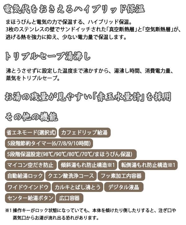 | まほうびんと電気の力で保温する、「ハイブリッド保温」。3枚のステンレスの壁でサンドイッチされた真空断熱層と空気断熱層が、逃げる熱を強力に抑え、少ない電力量で保温します。 |