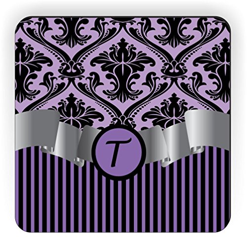 Rikki Knight Letter "T" Initial Purple Damask and Stripes Monogrammed Design Square Fridge Magnet
