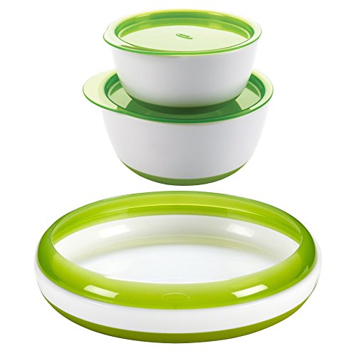 -. Binding : Baby Product -. Brand : OXO -. Feature : Non slip base adds stability and minimizes spills / High walls facilitate scooping food onto utensils / Secure lids for storing food / Plate ring helps keep food contained and assists when using utensils and can be removed when tot has mastered self feeding / Weighted for stability and durability; Non slip base -. Label : OXO -. Manufacturer : OXO -. ProductGroup : Baby Product -. ProductTypeName : BABY_PRODUCT -. Publisher : OXO -. Studio : OXO -. Title : OXO Tot Small and Large Bowl Set with Feeding Plate