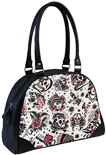 -. Feature : This purse features American traditional tattoo artwork on this Liquorbrand purse! From a raven, rose, dagger, headdress, skull, and snake, this is the perfect purse for any collector. P.R.Inted on front and back / This handbag is boutique quality, just look at the embossed Liquorbrand logo on the sides of this handbag / Interior zipper pocket. Fully lined in Liquorbrand logo P.R.Inted fabric / Full zipper closure. Measures 12 inches wide, 9 inches high, 5 inches deep. Strap drop measures 8 inches / Man-made materials