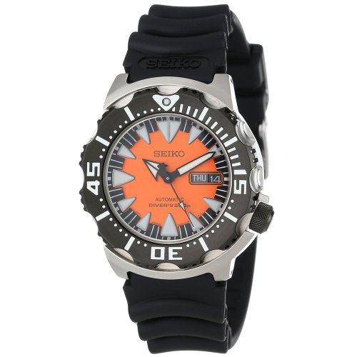 Studio : Seiko ReleaseDate : 2013-05-01 Publisher : Seiko Binding : Watch Product Description Stainless steel case with a black rubber strap. Uni-directional rotating black ion-plated bezel. Orange black dial with luminous hands and index hour markers. Minute markers around the outer rim. Dial Type: Analog. Luminescent hands and markers. Day of the week and date display at the 3 position. Automatic movement. Scratch resistant Hardlex crystal. Solid case back. Case diameter: 42 mm. Case thickness: 13 mm. Round case shape. Band width: 20 mm. Tang clasp. Water resistant at 200 meters / 660 feet. Functions: date, day, hour, minute, second. Casual watch design. Seiko Divers Automatic Black Orange Dial Stainless Steel Mens Watch SRP315. 0
