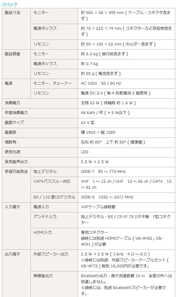 ●無線音出力:Bluetooth出力 : 最大到達距離 10 m 浴室の外へは到達しません。