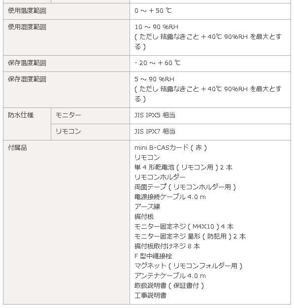 ●モニター固定ネジ ( M4X10 ) 4 本、モニター固定ネジ 星形 ( 防犯用 ) 2 本、据付板取付けネジ 8 本、F 型中継接栓、マグネット ( リモコンフォルダー用 )、アンテナケーブル 4.0 m、取扱説明書 ( 保証書付 )、工事説明書