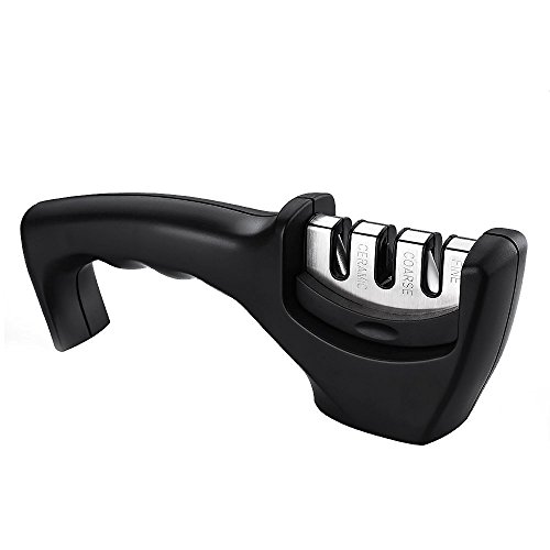 - SAFE, FAST & DURABLE: 3 Stage Knife Sharpener comes with slip-resistant rubber base maximizing stability making sharpening easy & minimizing risk of injuries! Ergonomically designed handle fits comfortably in hand making it safe & steady to sharpen on flat surfaces!