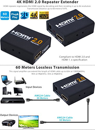 Integrated signal amplifier for extending HDMI cables up to 60m at 1080P@60Hz, 40m at 4K@30Hz, 30m at 4K@60Hz.