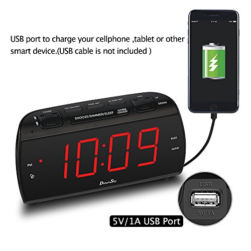 DreamSky Alarm Clock Radio With FM Radio And USB Port For Phone Charger , 1.8 " Large LED Digit Display With Dimmer , Snooze , Sleep Timer , Earphone Jack, DC Powered And Battery Backup .