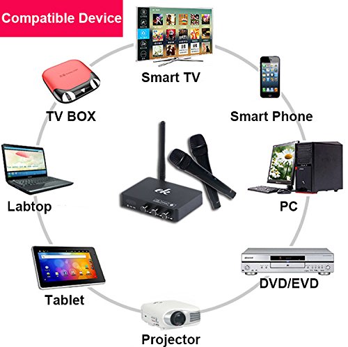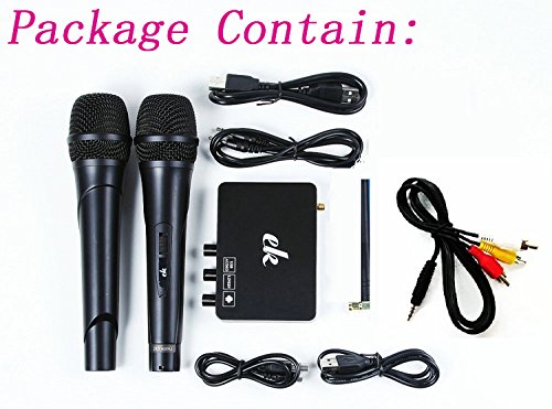 Package Includes: 1 x Sound Card Receiver Box with Antenna, 2 x Rechargeable Wireless Microphones; 1 x 3.5mm-3.5mm Audio Cables; 1 x 3.5mm - 2 Color Audio Cables; 3 x USB Cables (Please use your cell phone Charger or Power Bank as 5V DC Power support)