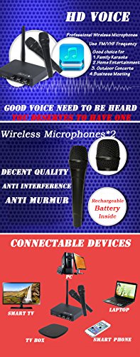 Descriptions: This is a wireless Sound Card microphone Karaoke System which uses FM/VHF frequency. Easy to be connected to PC, Smart TV, TV BOX, Smart Phone, Laptop and so on. A great ideal for family karaoke, home entertainment, outdoor concerts and business meeting etc. If you are a person who love Karaoke very much, come on, why not add one into your cart?