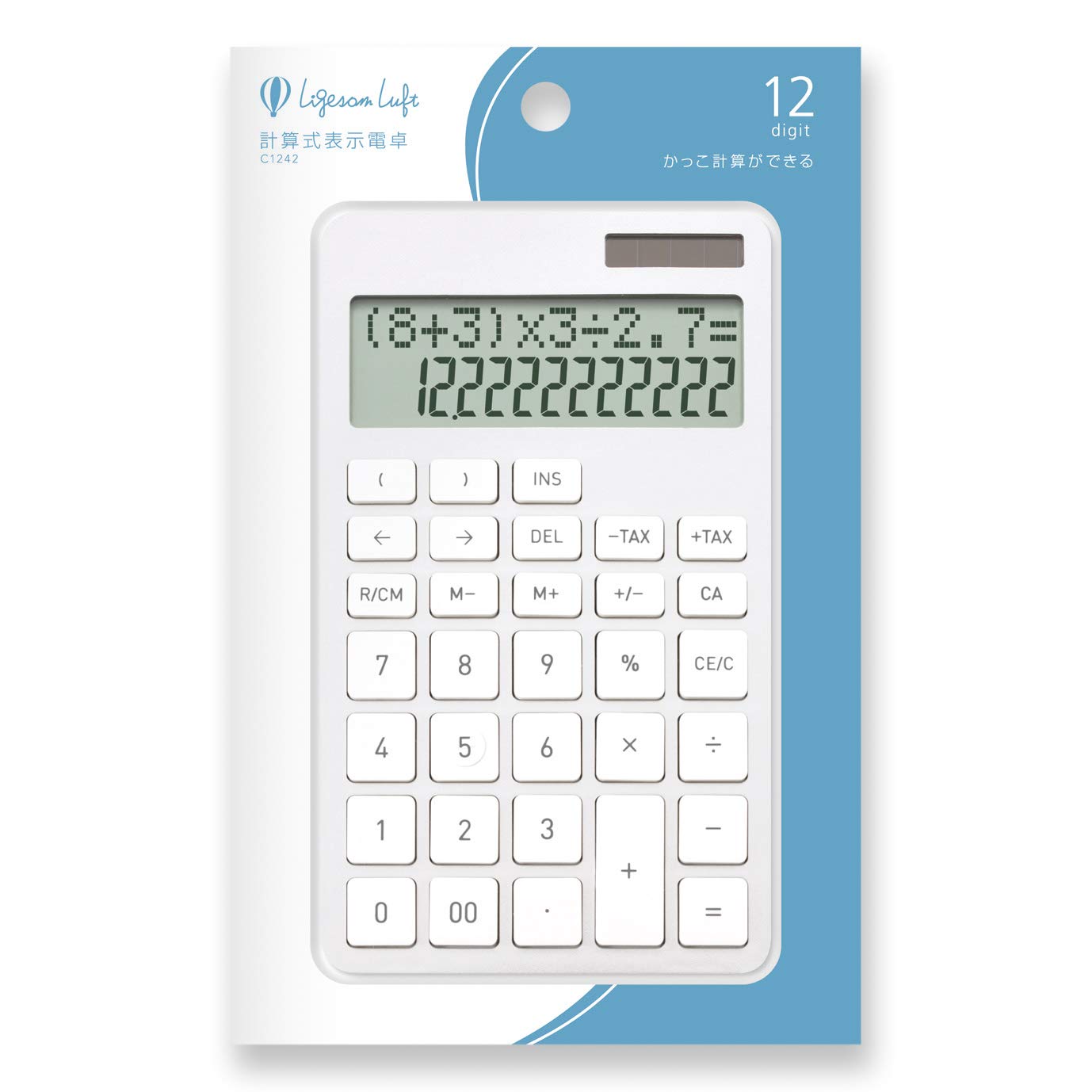 液晶上段に計算式が表示されるから、検算や式の修正も可能です カッコ計算ができるから複雑な計算もラクラク スタイリッシュな外観 税計算、メモリー機能あり 式の修正はカーソルで移動させINSボタンで挿入、DELボタンで削除が行えます