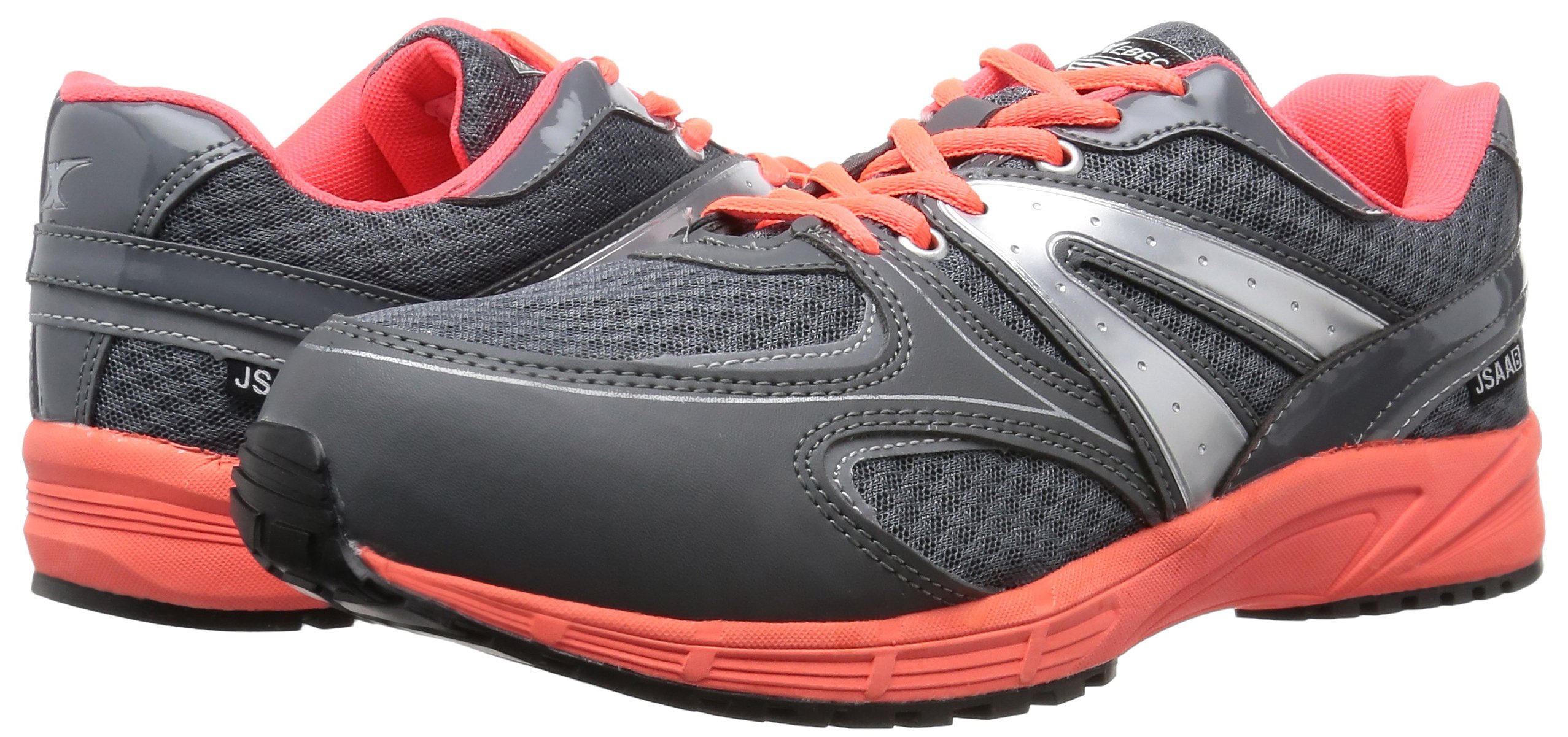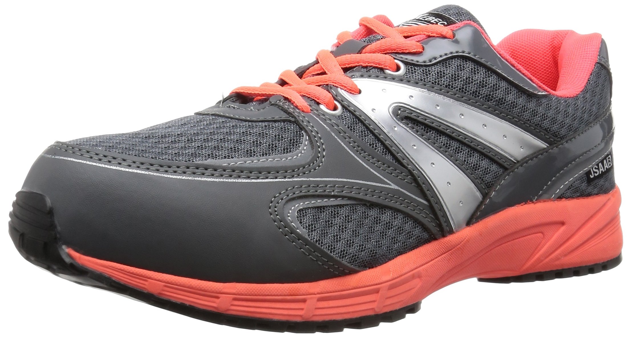 Ultra lightweight 600 g (both feet) mesh spec safety shoes with orange and green fluorescent colors vividly colored.