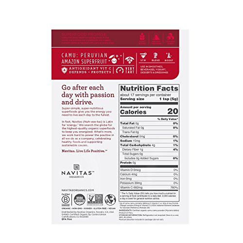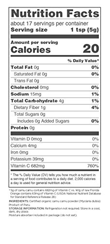 The camu berry is one of the world's most abundant sources of vitamin C—as much as 60 times more C per serving than an orange. This antioxidant-rich berry from the Amazon is also a plentiful source of potassium, calcium, protein, beta carotene, amino acids and powerful phytochemicals. Often called the Camu-Camu berry, this fruit grows on a low-growing shrub (Myrciaria Dubia) native to the lush climates along the Black Water River region of the Amazonian rainforest. The buzz about this potent berry has spread around the world, earning it the nickname “nature’s vitamin pill.” Containing a higher naturally occurring vitamin C content than any other food, camu has long been used for its nutritional and medicinal attributes. Navitas Naturals Camu is grown organically in Peru, where gentle low-temperature drying methods are used to protect and maximize the nutrient potential of this extraordinary superberry powder.Feature