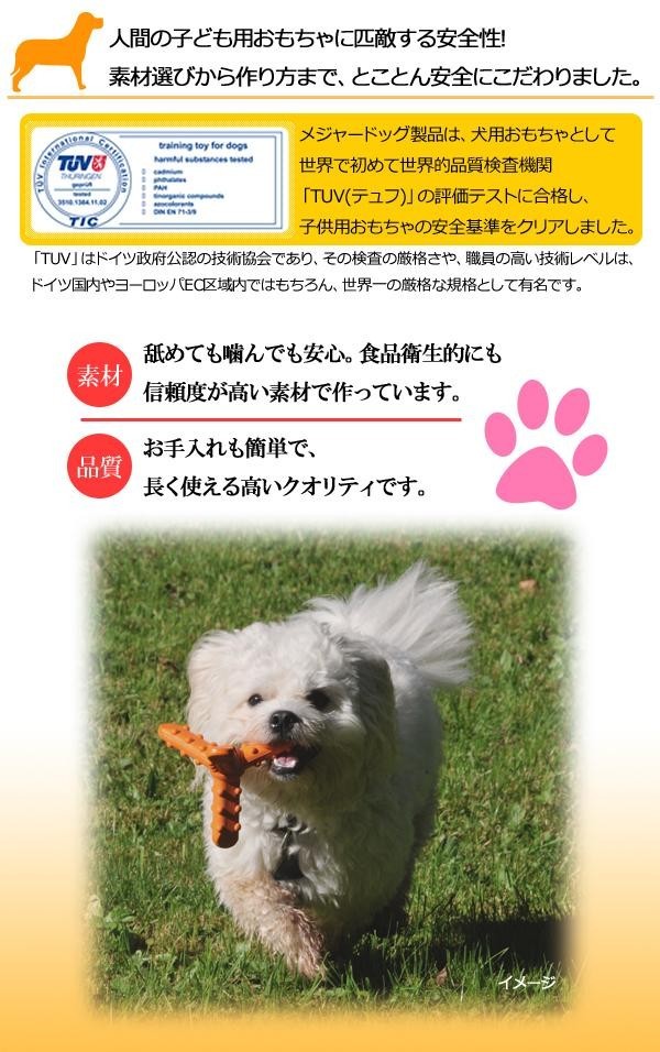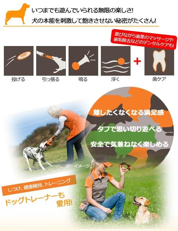 | 素材は耐久性が高く、ワンちゃんが噛んでも安心・安全なものを使用しています。ワンちゃんが長く楽しめるよう様々な工夫がなされているおもちゃです♪そのクオリティの高さは、ドッグトレーナーも愛用している程です! |