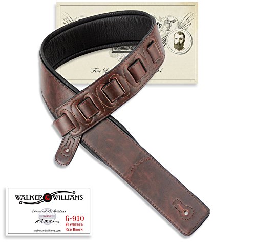 -. Brand : Walker & Williams -. Color : Dark Brown -. EAN : 0736024415291 -. Feature : Handmade Padded Guitar Strap Using All Top Quality Premium Materials / Weathered Mahogany Brown Natural Finished Top Welt / Super Comfortable Soft Padded Garment Leather Back / Matching Top Stitching / 2.75" Wide and Adjustable from 45-54" -. Label : Walker & Williams -. Manufacturer : Walker & Williams -. Model : G-910 -. MPN : G-910 -. PackageQuantity : 1 -. PartNumber : G-910 -. ProductGroup : Musical Instruments -. ProductTypeName : INSTRUMENT_PARTS_AND_ACCESSORIES -. Publisher : Walker & Williams -. Studio : Walker & Williams -. Title : Walker & Williams G-910 Mahogany Brown Weathered Natural Finish Guitar Strap with Padded Glove Leather Back -. UPC : 736024415291