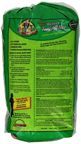 Feeding Guidelines:Standlee's jojo's BEST Premium Timothy Grass can be fed to rabbits, guinea pigs, hamsters, gerbils, chinchillas, prairie dogs and other herbivores. Feed Standlee's jojo's BEST Premium Timothy Grass along with the vitamin and mineral fortified feed specific to these animals. Standlee's jojo's BEST Premium Timothy Grass hay can be fed at a rate equal to 10% of the total diet. The Standlee's jojo's BEST Premium Timothy Grass is NOT intended to be the only component of the diet. Place hays in a hopper, bin or loose. Remove any uneaten hay if it becomes wet, damp or soiled. Always provide clean fresh water daily. Store hay in a cool dry place. Reclose after each use. Feeding a small amount of fresh hay stimulates chewing which aids in proper wear of teeth, and promotes a healthy digestive system. Ingredients: 100% Sun-cured Premium Timothy Grass