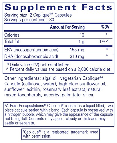 This formula provides the first vegetarian derived EPA and DHA in a vegetarian, liquid-filled Caplique® Capsule. Both omega-3 essential fatty acids are sourced from algae. Essential fatty acids promote healthy inflammatory balance and arachidonic acid metabolism. Decades of research indicate higher plasma levels of EPA and DHA are associated with cardiovascular health, platelet function, joint comfort, memory and skin health.