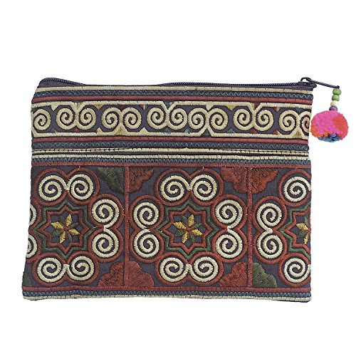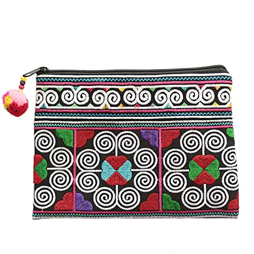 The vibrant colors, little pom-pom zipper and detailed embroidery will easily stand out every time you unzip to retouch your makeup or grab cash for a coffee. We've designed our little boho pouch to measure 7 inches by 5.5 inches in size. Compact enough to slide easily into any carrying bag but big enough to hold lipstick, eyeliner, eyeshadow and other small, loose items.