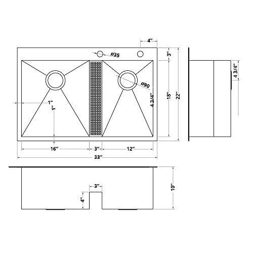 Exterior dimensions: 33" (wide) x 22" (front-to-back) | Interior dimensions: 16" x 18" (left) , 12" x 18" (right) x 10" (bowl depth) | Standard 3.5" drain openings will fit any garbage disposal unit