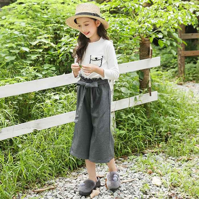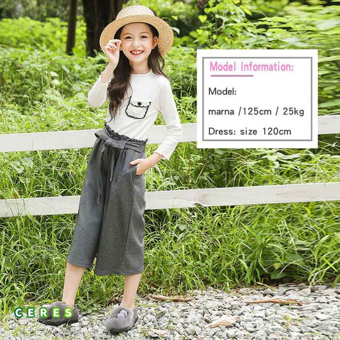 【製品仕様】■商品説明・首元まであったか柔らか素材・胸元のポケットがニット素材でポイントに!!・ガウチョパンツはポケット付き・ベルト代わりのリボンがアクセントに ■サイズ トップス 120cm: 肩幅:27cm バスト:32cm 袖丈:35cm 総丈:42cm 130cm: 肩幅:28cm バスト:34cm 袖丈:39cm 総丈:43cm 140cm: 肩幅:29cm バスト:35cm 袖丈:41cm 総丈:47cm 150cm: 肩幅:30cm バスト:37cm 袖丈:43cm 総丈:49cm 160cm: 肩幅:31cm バスト:39cm 袖丈:46cm 総丈:54cm 160cm: 肩幅:32cm バスト:40cm 袖丈:49cm 総丈:56cm ボトムス 120cm: ウェスト:24cm 総丈:60cm 130cm: ウェスト:25cm 総丈:63cm 140cm: ウェスト:26cm 総丈:66cm 150cm: ウェスト:27cm 総丈:71cm 160cm: ウェスト:28cm 総丈:76cm 170cm: ウェスト:29cm 総丈:80cm ■素材 トップス ポリエステル 95% ポリウレタン 5% ボトムス コットン 35% ポリエステル 65% 伸縮性有り■色ホワイト