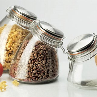 Elegant and whimsical air-tight glass storage jars serve as a decorative accessory on any kitchen or bathroom counter. Replacement gaskets available.