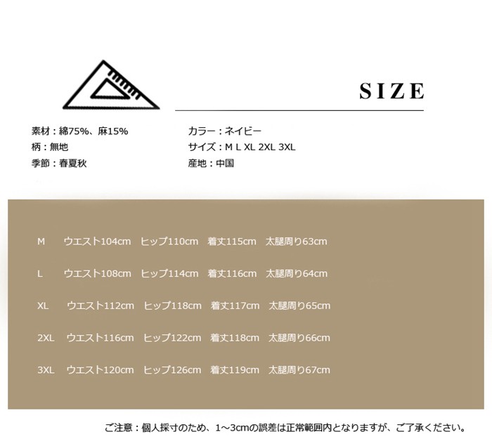 サロペット レディース 大きいサイズ サロペット オーバーオール 無地 サロペット ガウチョ オールインワン 大きいサイズ ゆったり 2018春夏新作 オールインワン 大きいサイズ サロペット レディース ガウチョ商品詳細素材:綿75%、麻15%柄:無地季節:春夏秋カラー:ネイビーサイズ:M L XL 2XL 3XL産地:中国サイズ参照表M ウエスト104cm ヒップ110cm 着丈115cm 太腿周り63cm L ウエスト108cm ヒップ114cm 着丈116cm 太腿周り64cm XL ウエスト112cm ヒップ118cm 着丈117cm 太腿周り65cm 2XL ウエスト116cm ヒップ122cm 着丈118cm 太腿周り66cm3XL ウエスト120cm ヒップ126cm 着丈119cm 太腿周り67cmご注意:個人採寸のため、1~3cmの誤差は正常範囲内となりますが、ご了承ください。サロペット レディース 大きいサイズ サロペット オーバーオール 無地 サロペット ガウチョ オールインワン 大きいサイズ ゆったり 2018春夏新作 オールインワン 大きいサイズ サロペット レディース ガウチョ