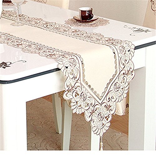 -. Feature : Material:polyester / Delicate embroidery and cut work make a beautiful way to dress up your home. / Table runner is accented with gold tassels on each end / Use alone or with coordinating tablecloths, chair back cover and cushion, placemats and table runner for an elegant display / Hand wash, easy machine wash, easy care.