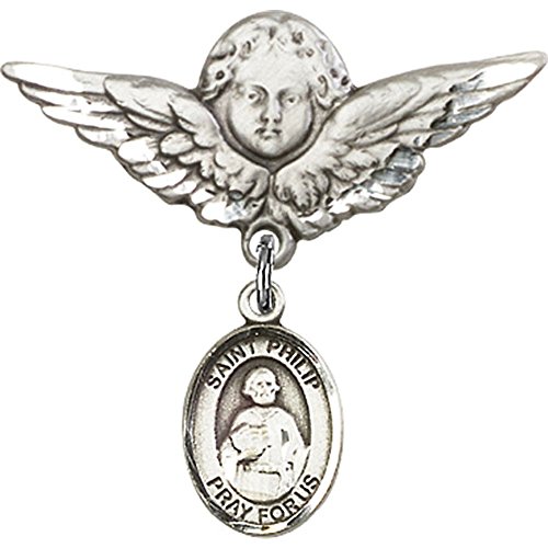 -. Title : Sterling Silver Baby Badge with St. Philip the Apostle Charm and Angel w/Wings Badge Pin 1 1/8 X 1 1/8 inches
