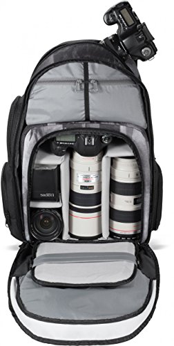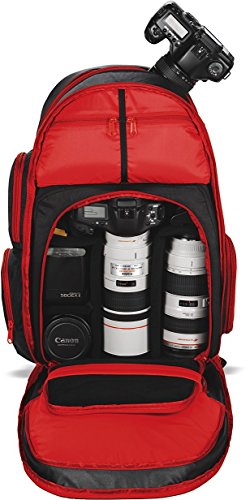 -. Feature : Vertical Board carry straps / Removable padded camera block / Tripod carry system / Deployable rain cover / Main compartment access to camera gear