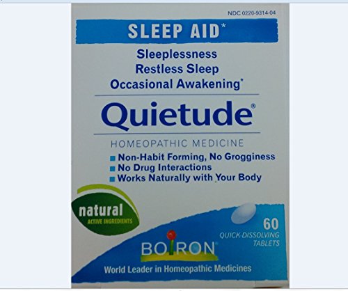 -. Binding : Health and Beauty -. Brand : Boiron -. EAN : 0306962610609 -. Feature : A homeopathic medicine that works naturally / Fast-acting when taken at the onset of symp / Non-habit forming / No side effects, no drug interactions, no contraindications, and no "masking" of symp / Regulated as a OTC (Over the Counter) drug by the FDA -. IsAdultProduct : 0 -. Label : Boiron -. LegalDisclaimer : IN NO EVENT, REGARDLESS OF CAUSE, SHALL ALL STAR SALES BE LIABLE FOR ANY INDIRECT, SPECIAL, INCIDENTAL, PUNITIVE OR CONSEQUENTIAL DAMAGES OF ANY KIND, WHETHER ARISING UNDER BREACH OF CONTRACT, TORT (INCLUDING NEGLIGENCE), STRICT LIABILITY OR OTHERWISE, AND WHETHER BASED ON THIS AGREEMENT OR OTHERWISE, EVEN IF ADVISED OF THE POSSIBILITY OF SUCH DAMAGES. -. Manufacturer : Boiron -. MPN : 0599043 -. NumberOfItems : 3 -. PackageQuantity : 3 -. PartNumber : 0599043 -. ProductGroup : Health and Beauty -. ProductTypeName : HEALTH_PERSONAL_CARE -. Publisher : Boiron -. Size : 60 tabs -. Studio : Boiron -. Title : Boiron Homeopathic Medicine Quietude Tablets for Restless Sleep, 60-Count Boxes (Pack of 3) -. UPC : 306962610609