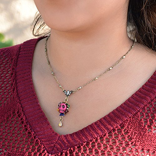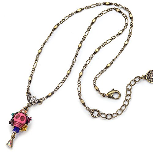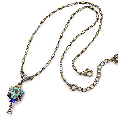 -. Feature : Colorful and stylish, wear this pendant necklace for protection, gook luck and the start of many conversations. Miniature calavera skull rests within a bronze frame, surrounded by hand painted metal and glass flowers. / Rainbow aurora borealis crystal stones are set in the dangling teardrop and the sculptured bracket connecting metal bead and figaro chain. Bronze metal finish and Swarovski crystal transmit quality and exquisite craftmanship. / Day of the Dead festivals have become popular for their cultural meaning and lavish and colorful symbols, particularly the skull, and also because it coincides with Halloween. / Size: 18" Long + 2" extender, drop 1.5" / Fabricated by hand in our Los Angeles studio, each is detailed in the manner of traditional Dia de los Muertos, (Day of the Dead) skulls