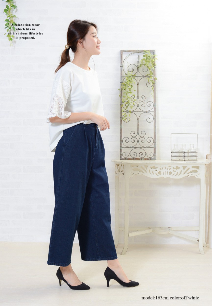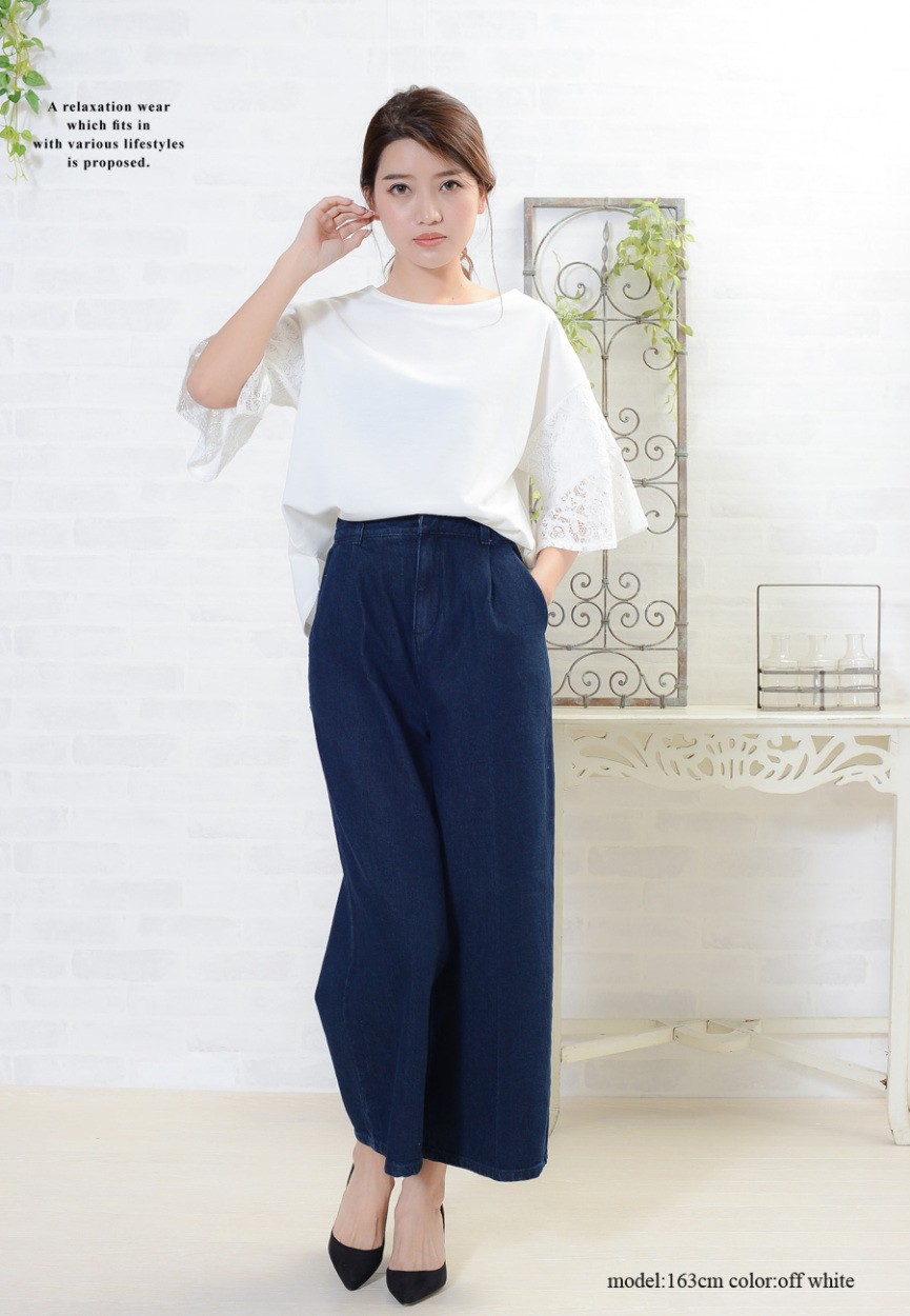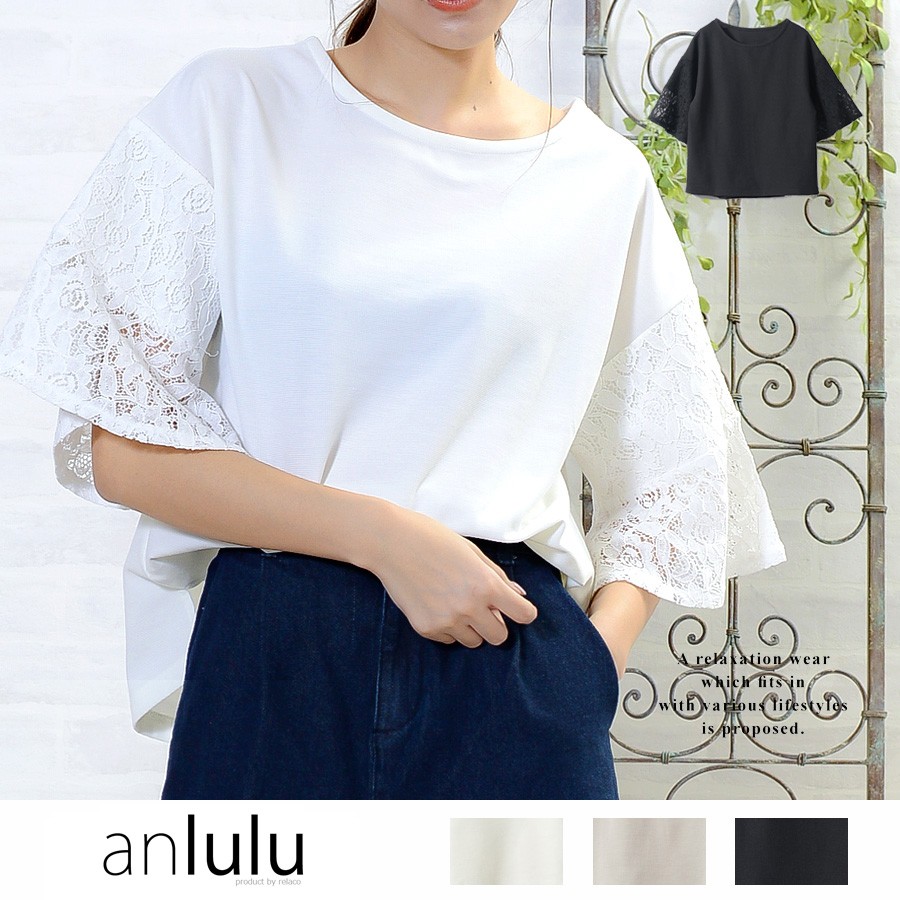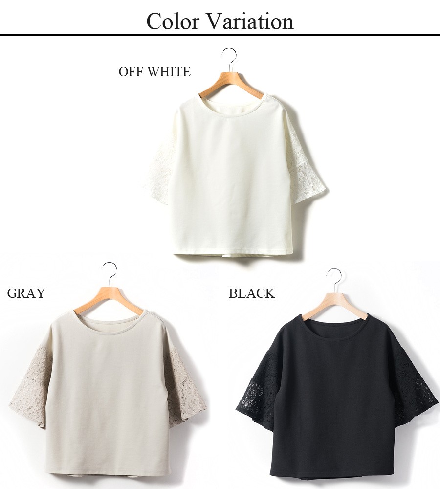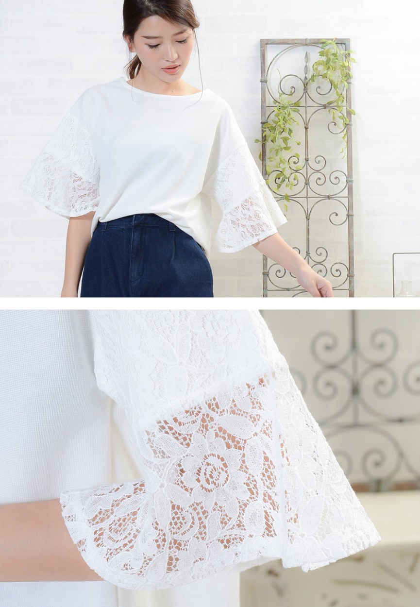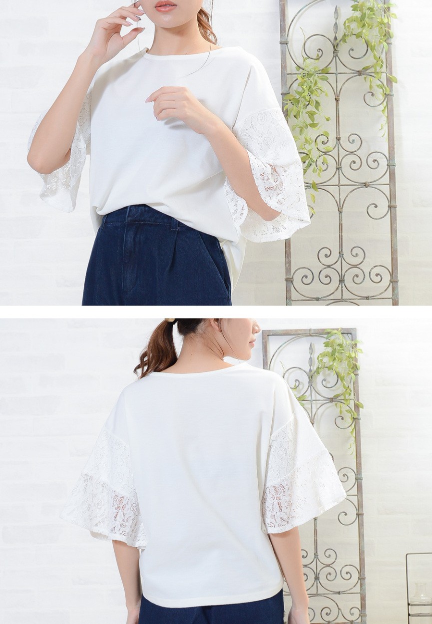 細かな凹凸の見られる、爽やかなミニワッフル素材を使用したデザインプルオーバー。袖の半分にレースが重ねられており、袖先に向かって広がりのあるラインを描きます。身頃はゆったり。裾は前上がりになっており、サイドスリットも入れられていますのでストンとしたシルエットが楽しめます。