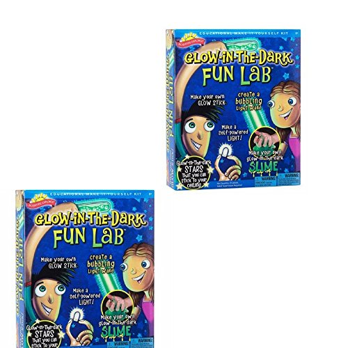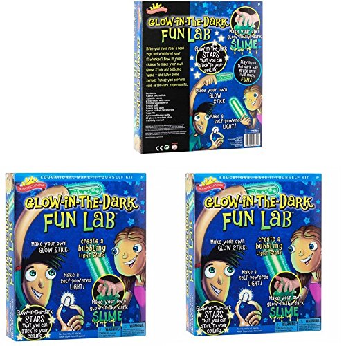 Scientific Explorer Glow in the Dark Fun Lab has 5 awesome glowing activities, including making glow in the dark slime, a glow stick, a bubbling wand and a human powered light bulb. Also included are 30 glow in the dark stars for making constellations on the ceiling. Kids learn science as they play. The dark has never been so much fun! The kit includes Zinc sulfide, sodium tetraborate, measuring scoop, 2 test tubes, vegetable oil, neon bulb, pipette, adhesive putty and activity manual. Recommended for children 8-years of age and older.Feature