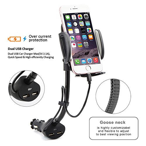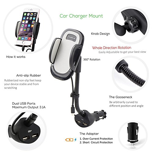 AUOPLUS Cigarette Lighter Phone Holder Car Mount Charger 3.1A Dual USB Ports with Built-in Charging Cord for iPhone