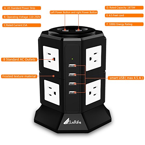 Multifunctional & Intelligent Power Strip and USB Charger: 8 AC outlets with 4 USB ports with the charging station for your cellphone tablet, laptop and Robotic Vacuum, Air Purifier,2 in 1 Combination between power strip and USB charger the socket with 8 AC outlets 100-125V and smart 4 USB ports 5V 2.1A, USB Total Input 5V 4.5A which empowers user to charge 12 electronic devices simultaneously.