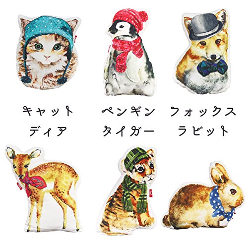 쿠션은 동물의 형태를 하고 있습니다♪디자인서는 털이 긴 모자를 쓴 고양이의 일러스트입니다♪