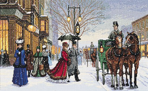Fur tippet and collar turned to ward off winter's chill, a Belle Epoque couple hurry to their waiting carriage. What evening awaits--Maxime's, the opera, perhaps the Moulin Rouge? Dream of the possibilities as you stitch this glowing depiction of another era. Kit contains cotton embroidery thread, 16-count dove grey Aida fabric, thread palette, needle and easy instructions including and easy-to-read multicolor chart. Finished Size: 16-Inch by 10-InchFeature