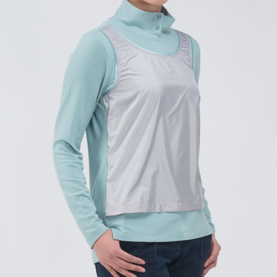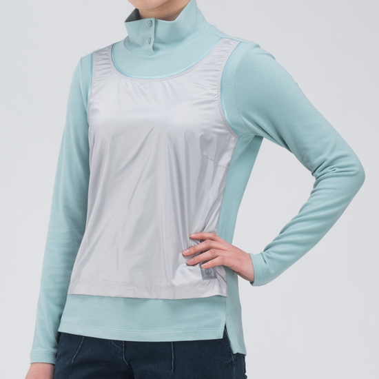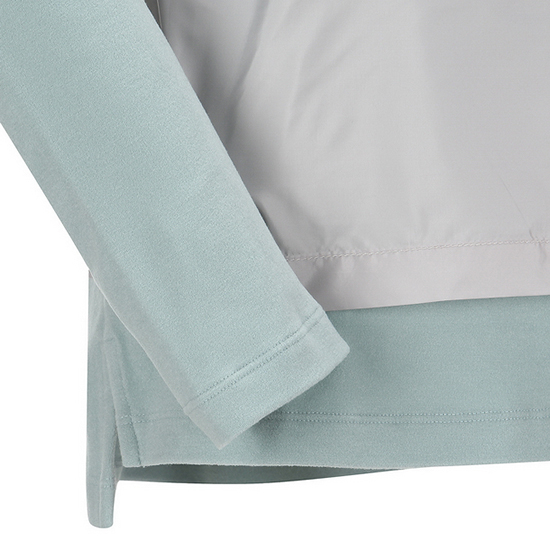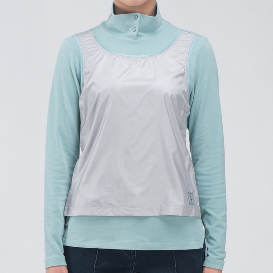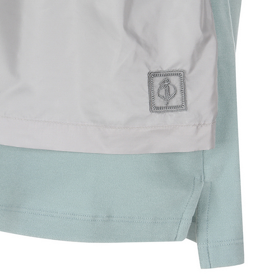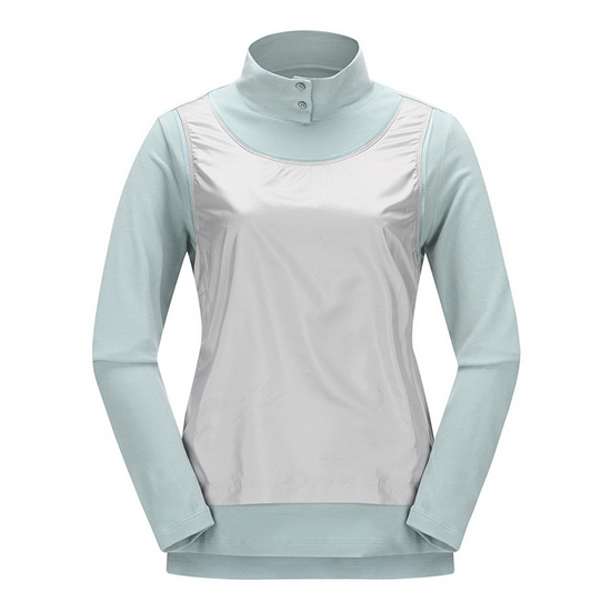 - 앞판 이소재 레이어드 디자인을 적용한 여성 티셔츠.
