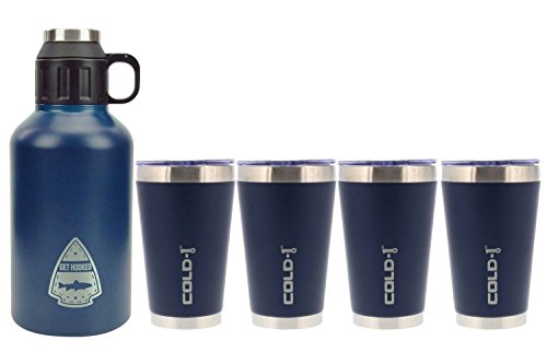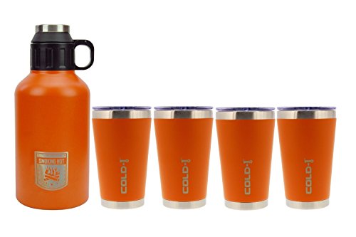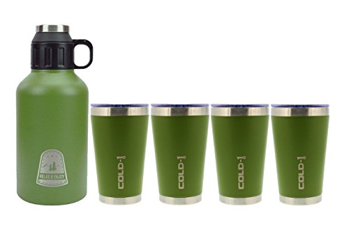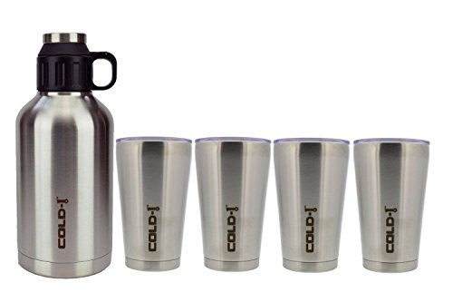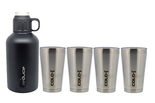 reduce COLD-1 Stainless Steel Insulated Growler and tumbler are designed to keep your drink cold and hot for hours to give you an all-day hydration experience. The growler is equipped with a double lid opening and a cup that doubles as a cup. This growler and tumblers are designed to not retain odors and to block harmful UV rays. The airtight lid also keeps carbonation in. This set including a 64-ounce growler and 4 16-ounce tumblers is perfect for travel.