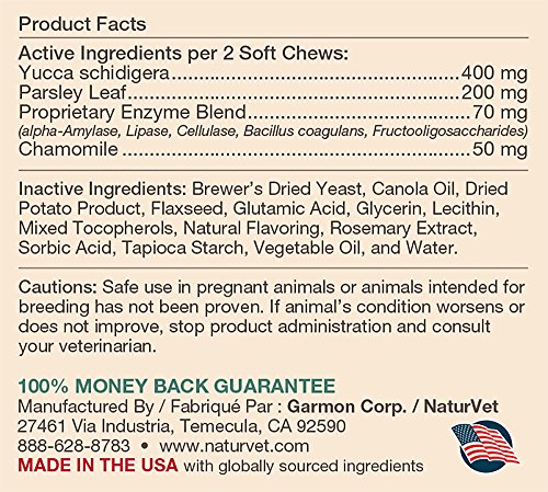 -. Feature : Helps deter dogs from Consuming their own stool or other dogs' stools / Recommended to help support the reduction of unpleasant pet odor / Contains a breath freshener as well as enzymes and probiotics / Our special formula blend of yucca, parsley, chamomile, and proP.R.Ietary enzymes helps dogs from consuming their own stool, or other dogs' stool, if they are also fed NaturVet Coprophagia. / Helps reduce unpleasant pet odors, plus added breath aid to freshen breath. / Wheat Free, Tasty Soft Chews 130ct for Dogs over the age of 12 weeks, do not give to Cats. / Active Ingredients per 2 Soft Chews: Yucca schidigera, Parsley Leaf, ProP.R.Ietary Enzyme Blend and Chamomile. / All NaturVet products are veterinarian formulated and manufactured in the USA in an FDA audited, cGMP compliant facility. / 100% Satisfaction Guarantee.