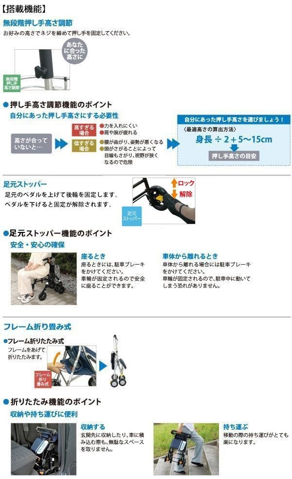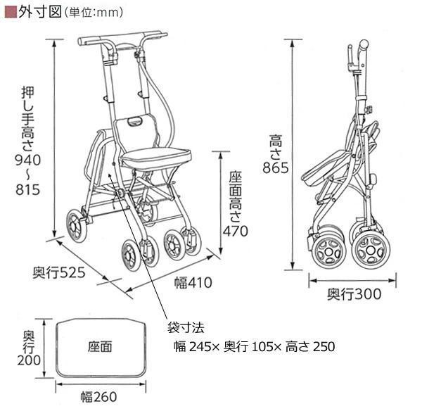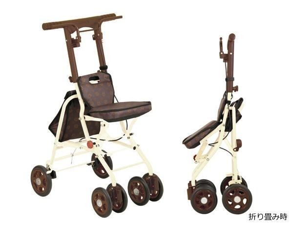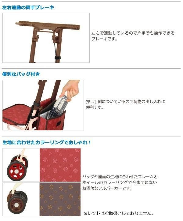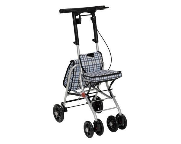 小回りがきくコンパクトさと、持ち運びしやすい軽量さが特徴のシルバーカーです。歩行で疲れた時は座って休むことができます。お散歩や毎日の買い物に最適です。 |