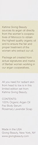 Includes: 100% Organic Kahina Argan Oil - 30 ml Fez Body Serum - 30 ml Rosemary Lavender Argan Soap - 100 g