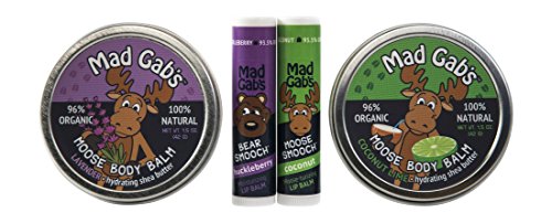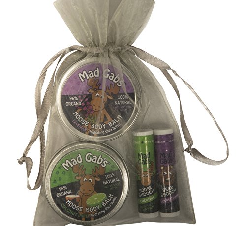 Gift Set includes: 1 Moose Lavender Balm, 1 Coconut-Lime Balm, 1 coconut Moose Smooch and 1 huckleberry Bear Smooch sticks