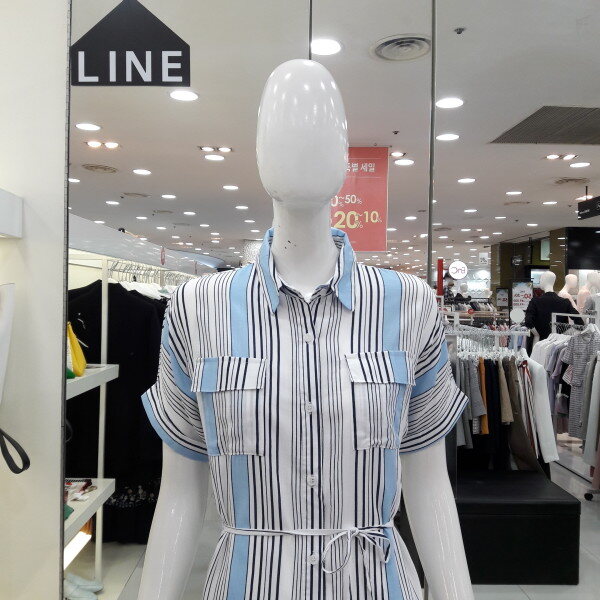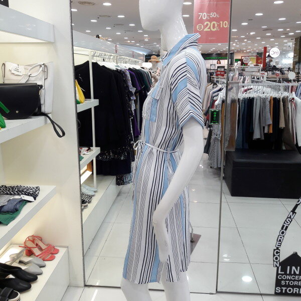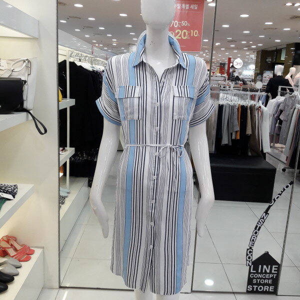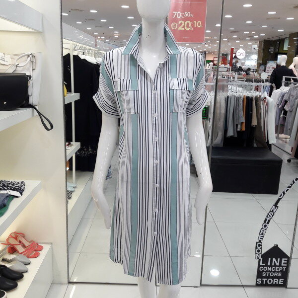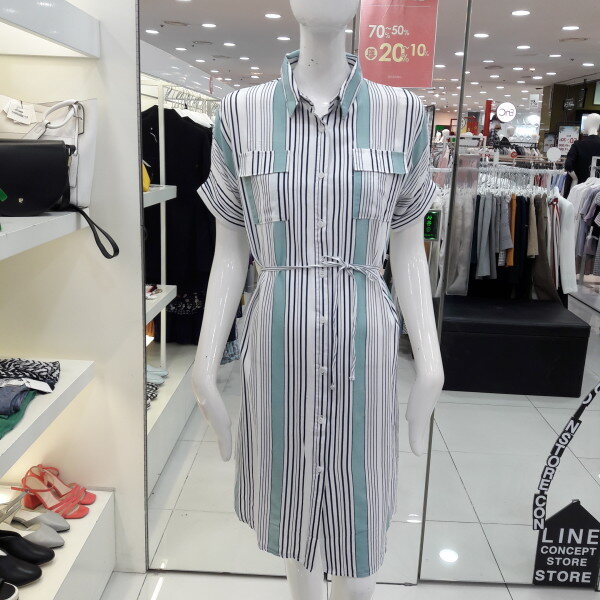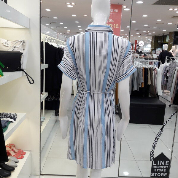 18년 여름 신상 기본카라로 되어있는 시원한 느낌의 스트라이프 원피스입니다 양쪽 포켓이 여성스러우며 활동성있게 박시라인으로 벨트 착용하여 라인을 잡아 착용하셔도 되는 스타일입니다